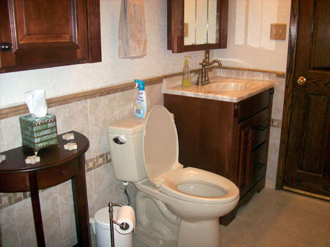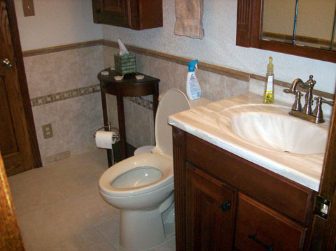 Completely remodeled ½ bath with 2 doors for walk through availability on new tile floor.