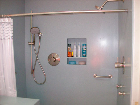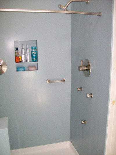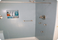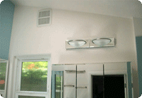 Mirror cabinets and glass shelves for a beautiful bathroom. You would never know that this room had water and mold damage.