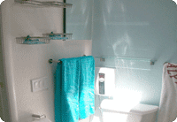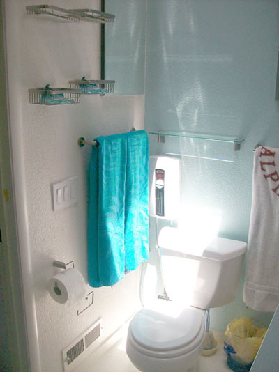 Wall shelve, towel rack and a hand held temperature controlled wash yourself thingy after you are done on the sun shine throne.