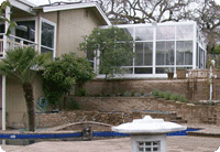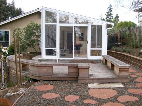 Trapezoid transom windows above the sliding door that leads out to the wood deck.