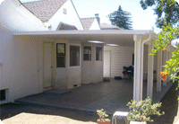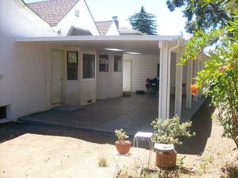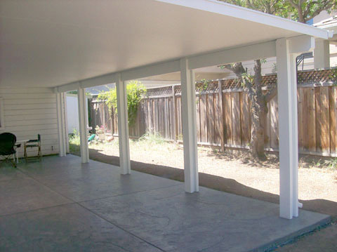 2 skylights in patio cover with a 2 tone gray slate stamped concrete slab.